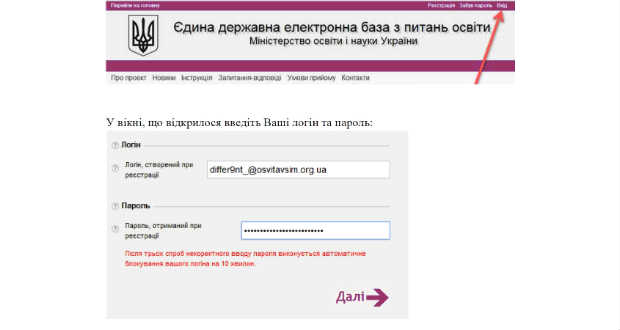 3. Be kell jelentkezni a jelentkező Saját fiókjába, oly módon, hogy újra felkeresi az ez.osvitavsim.org.ua webhelyet, és ott a Belépésre (Вхід) kattint. Majd a megjelenő ablakban bejelentkezik a felhasználónevével és jelszavával.