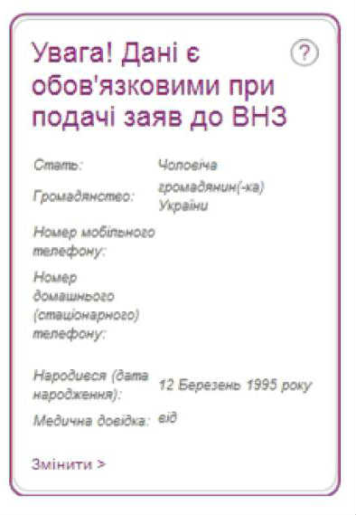 – megadnia a kötelező személyes adatait az alábbi felületen, oly módon, hogy a Változtat (Змінити) lehetőségre kattint: