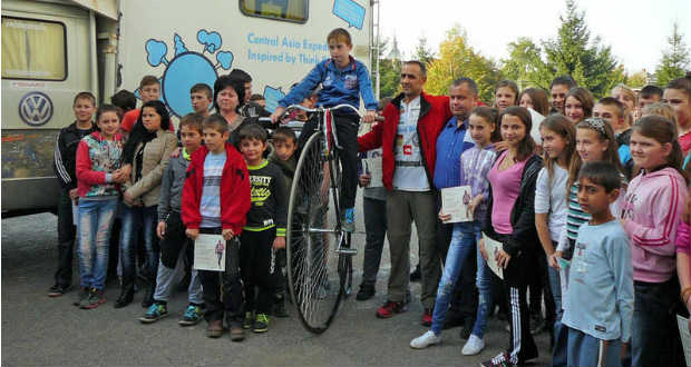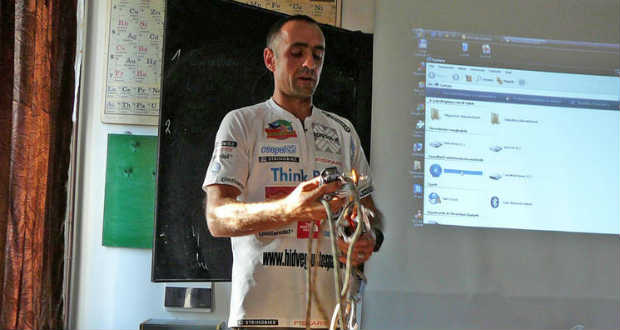 Az előadást a tiszai víziturát, az afrikai, valamint a közép-ázsiai expedíciót bemutató rövidfilm levetítése, az expedícióknál használt túlélőcsomagok bemutatása színesítette. Majd az iskola udvarán a vállalkozó kedvű gyermekek sikerrel bemutatták, hogy a szükséges három percen belül képesek rendezetten összegöngyölni egy hegymászókötelet, s tehettek egy-egy kört Hidvégi-Üstös Tamás speciális kerékpárjával…