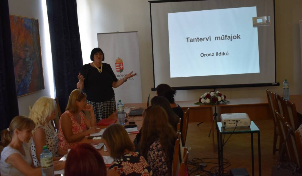A résztvevőket Orosz Ildikó, a KMPSZ és a Rákóczi-főiskola elnöke köszöntötte, aki előadását a tanterv fogalma köré szervezte. A gyakorlati megközelítéssel és példákkal tarkított előadásban a hangsúly a tanterv műfajának fogalmára, felépítésére, szerkezetére, a tanítás-tanulás rendszerelméletű modelljeire, az oktatási-nevelési folyamatokra, kompetenciafejlesztésre esett. Orosz Ildikó emellett kiemelte a KMPSZ lényeges szerepét az anyanyelvi oktatás folyamatának fejlesztésében és vívmányait a magyar iskolák anyanyelvi oktatásának biztosítására.