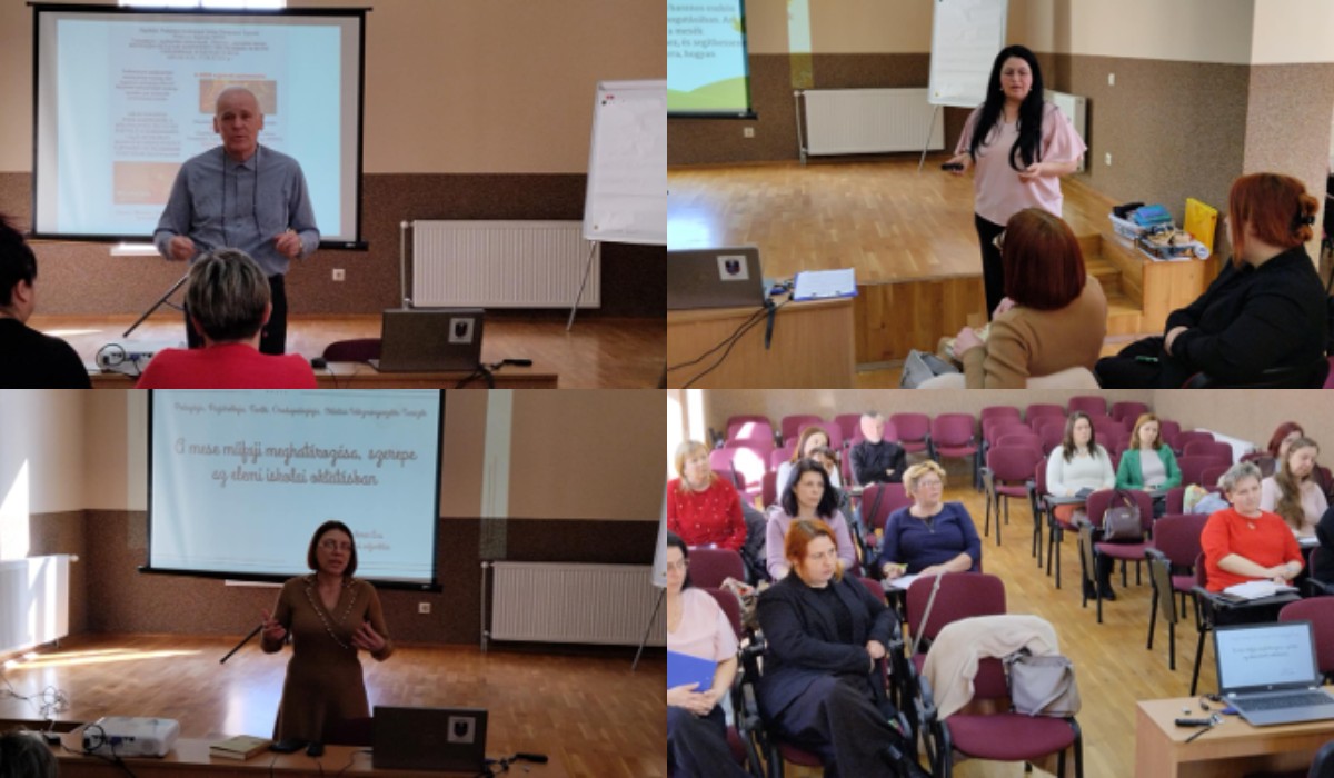 A bevezető előadás után a résztvevők érdekes előadásokat hallgathattak meg a meseterápiával kapcsolatban. Előbb Illés Éva, a Kárpátaljai Pedagógus-továbbképző Intézet Beregszászi Tagozatának módszerésze „Mi fán terem a meseterápia” című előadásában bemutatta hogyan lehet alkalmazni a meseterápiát a különleges bánásmódot igénylő alsó tagozatos gyermekeknél. Az alkotó-fejlesztő meseterápiában a hangsúly a személyiségfejlesztésen, a mindennapi életminőség javításán, a közösségi élmény megteremtésén és a cselekvőkészség aktivizálásán van. A folyamatban résztvevőket arra ösztönözzük, hogy az előttünk álló nehézségek, hiányok áthidalása, kiküszöbölése, kijavítása adaptív megküzdéssel megvalósítható.