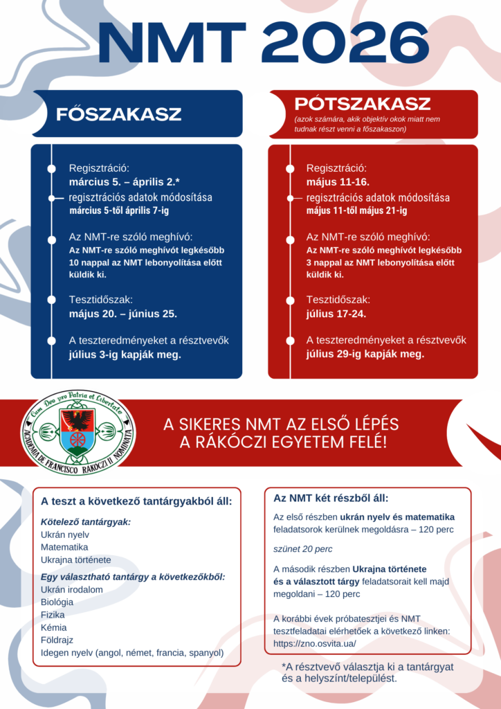 A felkészülést segítik a korábbi évek próbatesztjei, valamint a ZNO és az NMT hivatalos feladatsorai, amelyek online elérhetők a https://zno.osvita.ua/ oldalon. A 2026-os NMT-hez kapcsolódó legfontosabb tudnivalókat magyar és ukrán nyelvű infografikák is összefoglalják, megkönnyítve a jelentkezők számára a tájékozódást.
