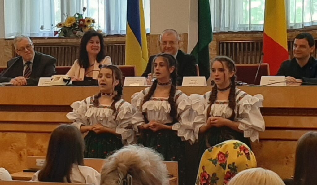 A köszöntő beszédeket követően a román, szlovák és magyar diákok csoportjai egy-egy népdalt énekeltek el.