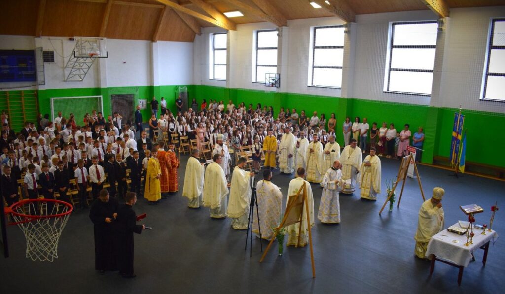 Az idei tanévnyitó ünnepség a korábbi évek hagyományai szerint szent liturgiával kezdődött, melyet ezúttal – a helyi templom renoválása miatt – az intézmény tornatermében tartottak meg.
