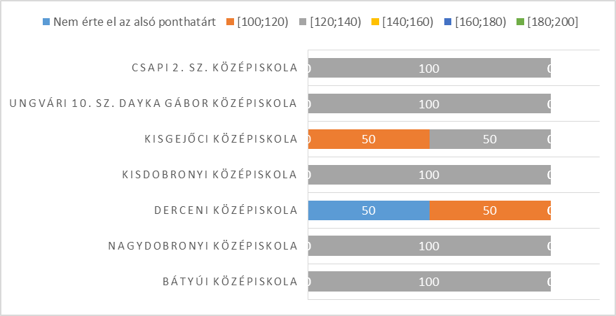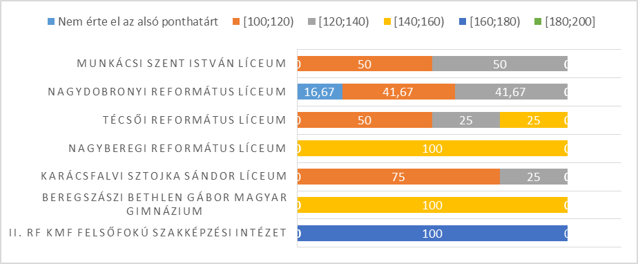 Fizikából is a tehetséggondozó jelleggel működő oktatási intézmények bizonyultak a legeredményesebbnek. Szinte mindegyik intézményben pozitívan teljesítették a vizsgát, csupán a Nagydobronyi Református Líceum tanulóinak 16,67%-a nem érte el az alsó ponthatárt. 180–200 közötti pontszámokra a tehetséggondozó jelleggel működő intézményekből senki nem telesített. 160–180 pont között a II. RF KMF Felsőfokú Szakképzési Intézetének vizsgázója teljesített. Az eloszlásokat az alábbi ábra szemlélteti.