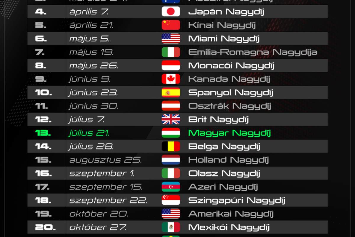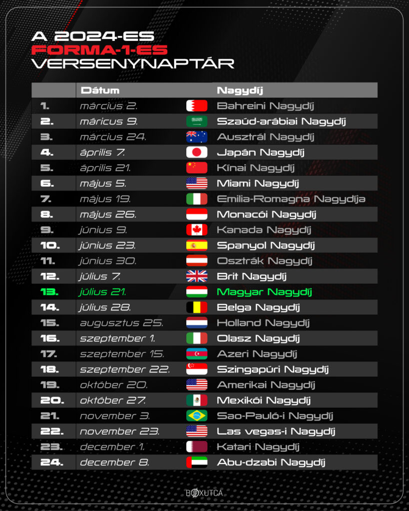 Szerdán, kora délután kiadták a 2024-es versenynaptárat, ami – az eredeti 2023-as tervezethez hasonlóan – huszonnégy helyszínt tartalmaz: új pálya ezúttal nem érkezik, visszatér viszont Kína és Imola, nő a szombati futamok száma és jön egy hosszabb őszi szünet is.