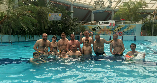 Először az élményfürdőbe érkeztünk, ahol egész délután nagy pancsolások és csúszdázások voltak. A nagyobb gyerekek közül, akik bátrabbak voltak még szaltóztak is a vízben, az édesapák pedig csúszásbajnokságot rendeztek, akik közül a csongori Marton Tibor nyerte az első helyet. Megebédeltünk, majd a délután folyamán még volt lehetőségünk jacuzzizni, hullám medencézni, volt sodró folyosó és mászófal is. Este elfáradva tértünk szálláshelyünkre.