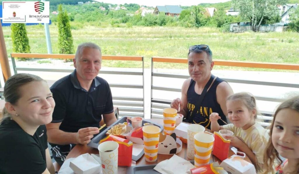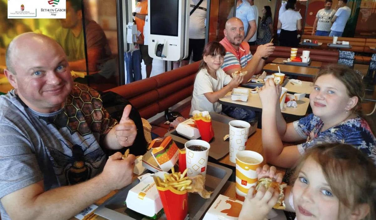 A fürdőzés befejezése után egy közös csoportképet készítettünk az uszoda bejáratánál, majd a munkácsi McDonald’s gyorsétterembe mentünk át, ahol a nagycsaládos egyesület hívott meg mindenkit egy ebédre. A gyerekek nagyon örültek a hamburgernek, és itt már volt lehetőség beszélgetni a többi családdal is. Elég sokat kellett várni az étel elkészültére, de engem ez nem zavart, mert addig beszélgettünk a lányaimmal és a többi családdal.