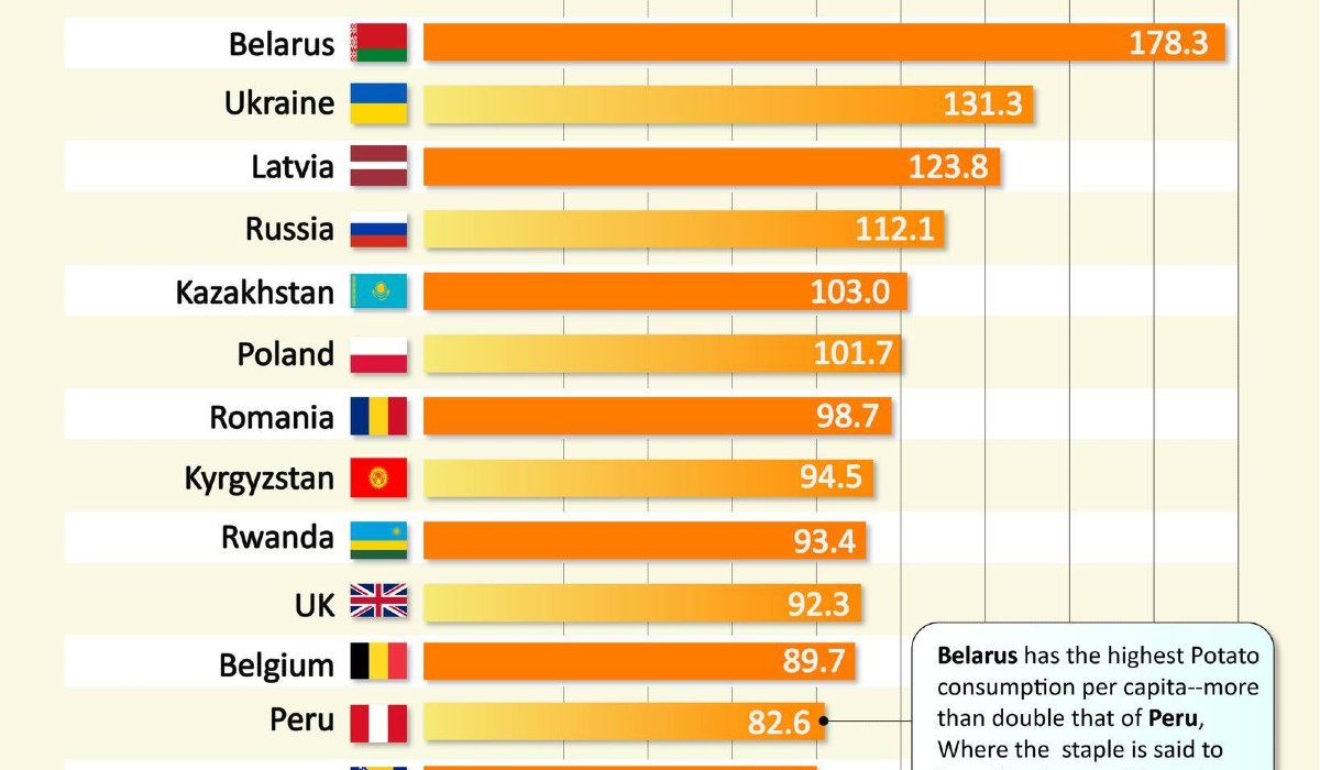 A RankingRoyals oldalán közzétett információk szerint egy fehérorosz 178,3 kilogramm burgonyát fogyaszt évente