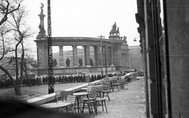 A megszálló szovjet alakulatok kezdetben megakadályozták a közeledő tömegnek a Hősök terére való bejutását, amely így a víz nélküli csónakázó tavon keresztül közelítette meg az Ismeretlen Katona sírját, és helyezte el a megemlékezés virágait. Egyes források szerint Münnich Ferenc fél tizenkettő környékén két magas rangú szovjet tiszt társaságában a helyszínre érkezett, és a tömeg térre történő átengedésére utasította az egyenruhásokat. A néma és kegyeletteljes megemlékezés mintegy három órán keresztül zajlott, a jelképes sír előtt hosszan kígyózó sor végül csendesen elapadt, bár sokan átsétáltak az amerikai követség elé.