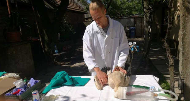 A Hortobágyi Madárpark – Madárkórház Alapítványt Matúz István hivatásos vadász, újságíró május 16-án értesítette a bajba jutott fehér gólyáról. A természetjáró Tiszapéterfalván talált rá a szárnyaszegett madárra. A bajt egy villámhárítót rögzítő drót okozta. Mivel a szárnyast járványveszély miatt a hatóságok segítőkészsége ellenére sem tudták Magyarországra szállítani, ezért a madárkórház munkatársai vállalkoztak az életmentő határátlépésre. Altatógéppel szerelték fel mikrobuszukat, s egy péterfalvai kerti (műtő)asztalon hamarosan új esélyt kapott a hosszú lábú bajba jutott.