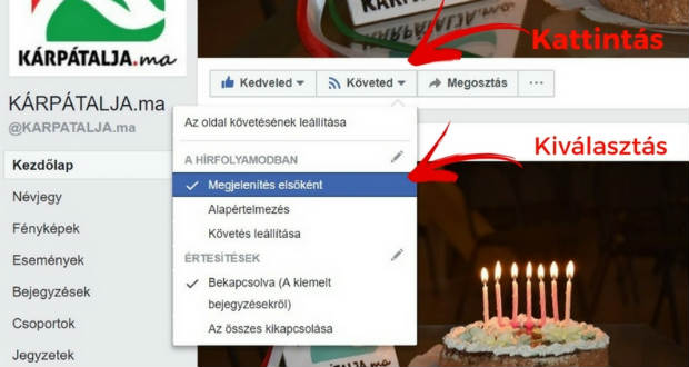 Facebook-oldalunkon a borítókép alatt kattintson a Követed menüpontra, majd a legördülő menüből válassza a ki a Megjelenítés elsőként lehetőséget.