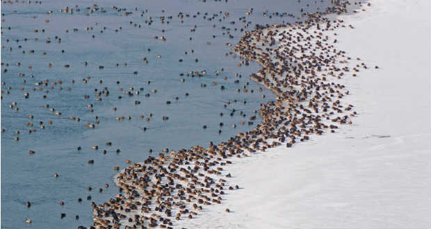 Egy fonyódi csapat videót forgatott arról, ahogy egy tőkésréce raj a Balaton jegén tevékenykedik.