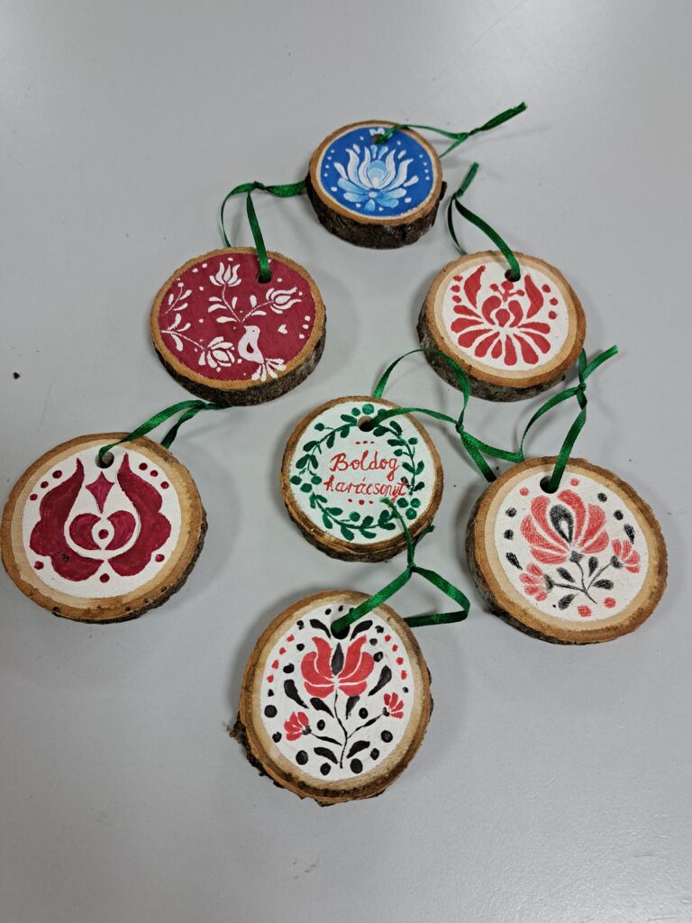 Fakorongokra karácsonyi motívumokat festettek. A hagyományos népi minták és a saját elképzelés szerinti karácsonyi képek egyaránt helyet kaptak a díszeken.