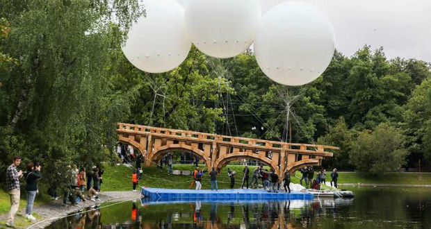 Nem mindennapos művészi alkotást készítettek el Moszkva egyik közparkjában. Egy francia formatervező vezetésével több önkéntes 300 kartondobozból épített egy hidat.
