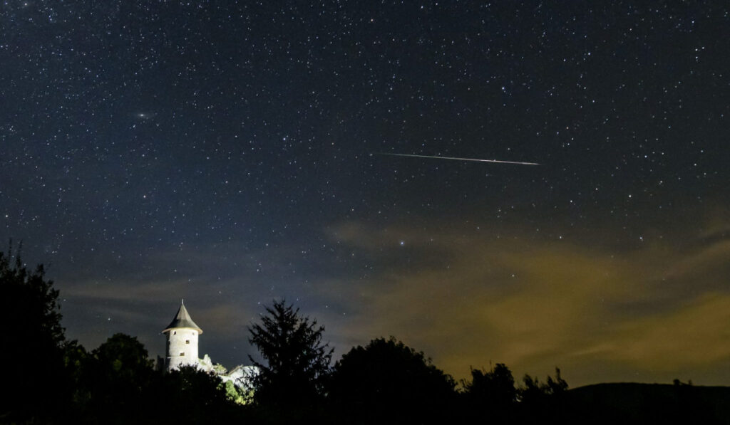 Meteor az égbolton a somoskői vár felett Salgótarjánból fotózva (Fotó: MTI/Komka Péter)