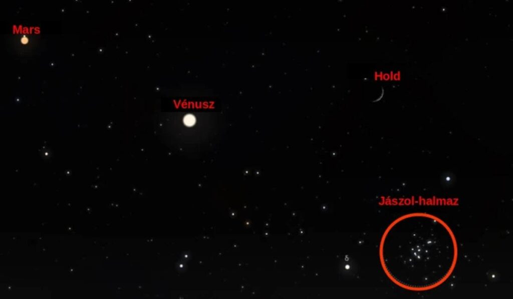 „Ha szerencsések vagyunk, és sikerül olyan helyet találnunk, ahonnan jól látszik a horizont, a Hold alatt, a Rák csillagképben észrevehetjük a Jászol-halmaznak nevezett látványos csillaghalmazt is” – áll a kommünikében.