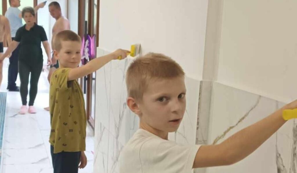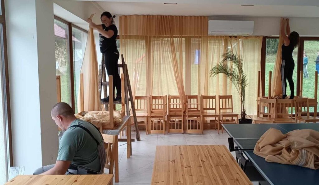 Péntek délelőtt a csapadékos időjárás miatt a panzió belső tereiben zajlottak a munkálatok. A csapat férfi tagjai kisebb javításokat végeztek az arra szoruló bútorzaton, nyílászárókon. Ezalatt a hölgyek megtisztították az ablakokat, a helységek dekorálásával és szépítésével foglalkoztak. Ebéd után, a délutáni órákban kiegészült az önkéntesek csapata, minden tagcsalád megérkezett és jó hangulatú beszélgetéssel, ismerkedéssel és tervezéssel telt a péntek délután.