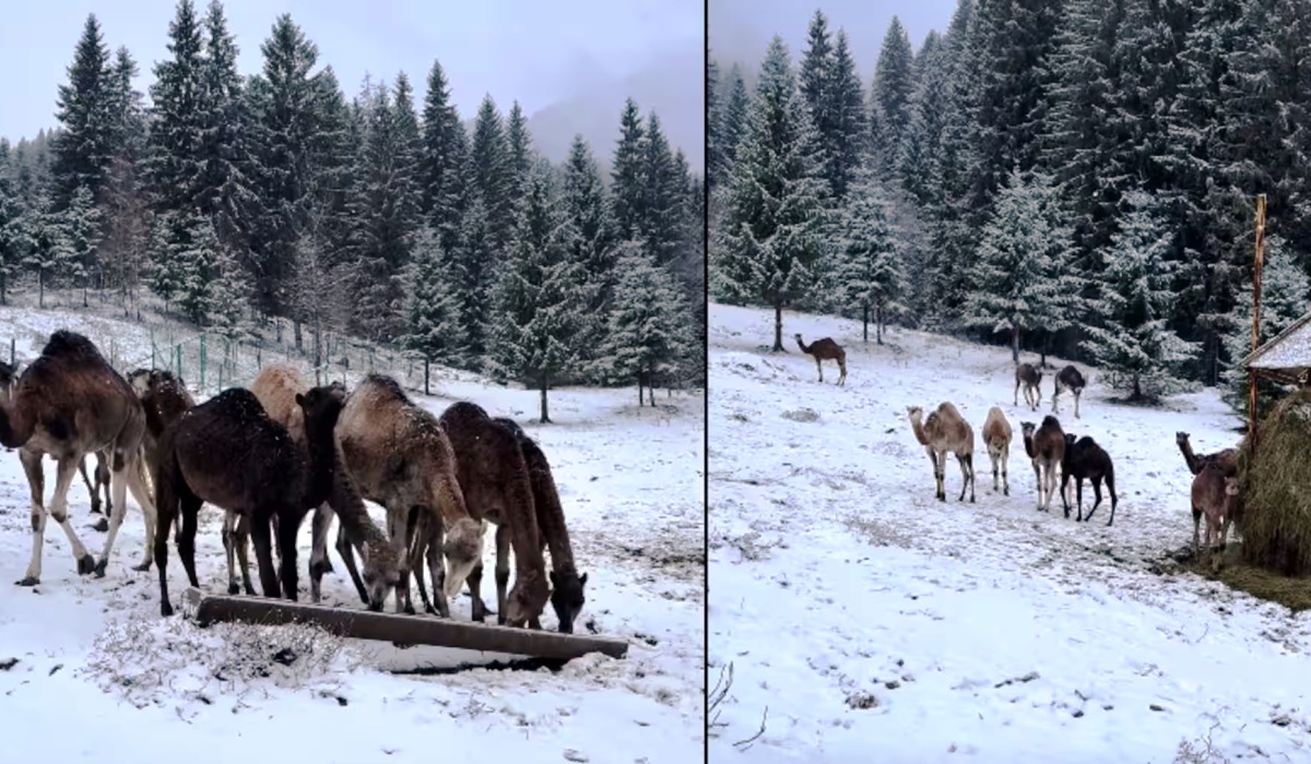A csodás hegyi környezetben működő állatpark tevéi életükben először találkoztak a hóval. A szokatlan jelenség láttán a jószágok óvatosan lépkedtek a fehér hótakarón, de később már azt is kipróbálták, hogy ehető-e.