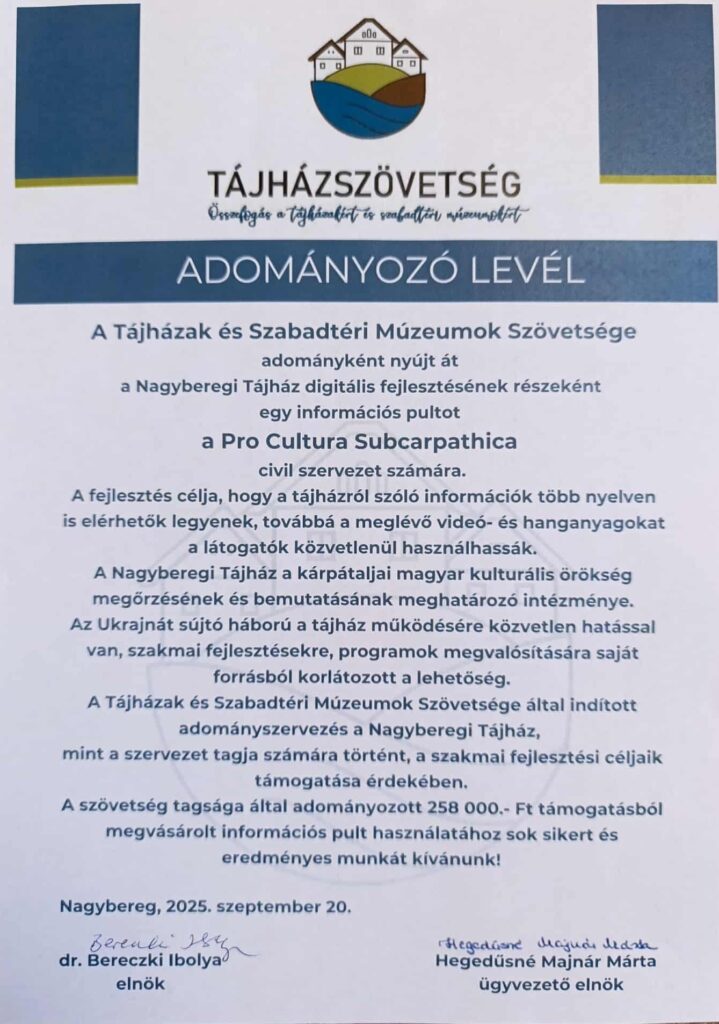 Nagyértékű adományt kapott a Nagyberegi Tájház a Tájházak és Szabadtéri Múzeumok Szövetségének jóvoltából. Az intézmény egy információs pulttal gazdagodott, melynek célja, hogy a tájházról szóló információk, adatok több nyelven és közvetlenül is elérhetővé váljanak a látogatók számára.