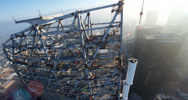 Az építőmunkások szombaton helyeztek el egy tíztonnás elemet a Los Angeles belvárosában épülő Wilshire Grand Tower tetején. A toronyház a 49 méteres csúcselemmel együtt így már elérte a 335 méteres magasságot, és ezzel az Egyesült Államok nyugati felének legmagasabb épülete lett.