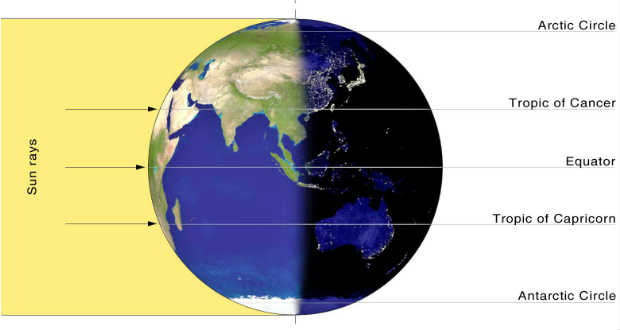 A földtengely nem merőleges arra a síkra, az ekliptika síkjára, melyben bolygónk a Nap körül kering, hanem 23 fok 27 perces szöget zár be vele, ezért március 20-21-től (néha 19-től) szeptember 22-23-ig a déli félteke, szeptember végétől március végéig pedig az északi félteke trópusi szélességi köreit érik 90 fokban a napsugarak. Amikor viszont a Nap látszólag átvándorol a két trópusi öv között, sugarai épp az Egyenlítőre hullnak merőlegesen, így létrejön a napéjegyenlőség. Két azonos típusú, tehát tavaszi vagy őszi napéjegyenlőség között 365 nap 5 óra 48 perc 45 másodperc telik el. Ezt az időtartamot tropikus évnek nevezzük, s ez naptárunk alapja.