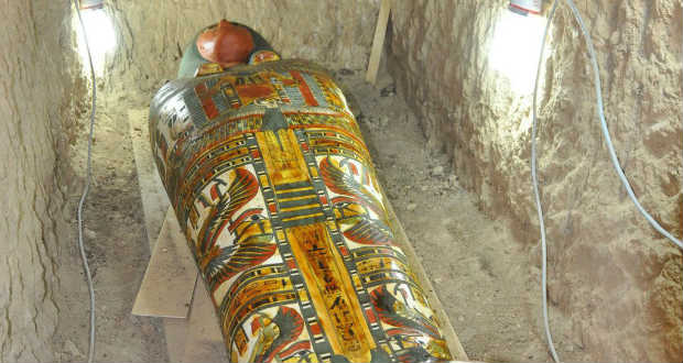 A gipsszel rögzített, vászonba csavart múmiát élénk színű, fából készült szarkofágban temették el egy a III. Thotmesz harcos fáraó idejéből származó templom közelében.