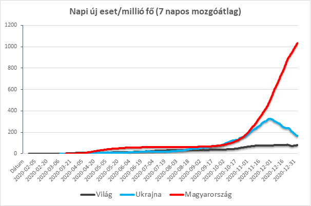 A vírus jelenleg is terjedőben van, a legtöbb ország épp a második vagy harmadik fertőzési hullámmal küzd. Világszinten összesen körülbelül 94 millió esetről tudunk eddig, melyek közül 2 millió volt halálos kimenetelű. Ukrajnában eddig körülbelül 1,18 millió esetet mutattak ki, melyek közül kb. 21,3 ezer volt halálos kimenetelű.[5] Magyarországon kb. 349 ezer pozitív esetről tudnak, és ezek közül körülbelül 11 ezer volt végzetes. Az ábrán látható diagram az egymillió főre vonatkoztatott napi új esetszámok alakulását mutatja Ukrajnában és Magyarországon a világadatokkal összevetve.[6] A görbén jól látszik az, hogy mindkét országban jelentősen meghaladják az esetszámok az átlagosnak tekinthetőeket. Ezek az adatok természetesen nagyon sok tényezőtől függenek. Jelentős hatása van ezekre a számokra például annak is, hogy hány tesztet végeznek el. Természetesen ebben az esetben is igaz az, hogy minél nagyobb a mintavétel, annál pontosabban jellemezhető a populáció. A mintavételek száma mindkét országban visszaesett az utóbbi időben, ami valószínűleg az ünnepi időszaknak volt köszönhető elsősorban. A tendenciák alapján jól látszik, hogy a járványhelyzet minél gyorsabb megoldásra vár. Ennek jelenleg 3 útja lehet: