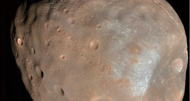 A Marsnak két kis holdja van, a Phobosz és a Deimosz, amelyek viszonylag közel keringenek hozzá. Mindkettő szabálytalan formájú, átmérőjük kevesebb mint 30 kilométer. A nagyobbik, a Phobosz csupán hatezer kilométeres távolságban kering a Mars körül és enyhén spirál alakú pályáján folyamatosan közelít hozzá. Összehasonlításképpen: a Föld Holdjának átmérője 3500 kilométer és 400 ezer kilométer távolságban kering a bolygó körül.