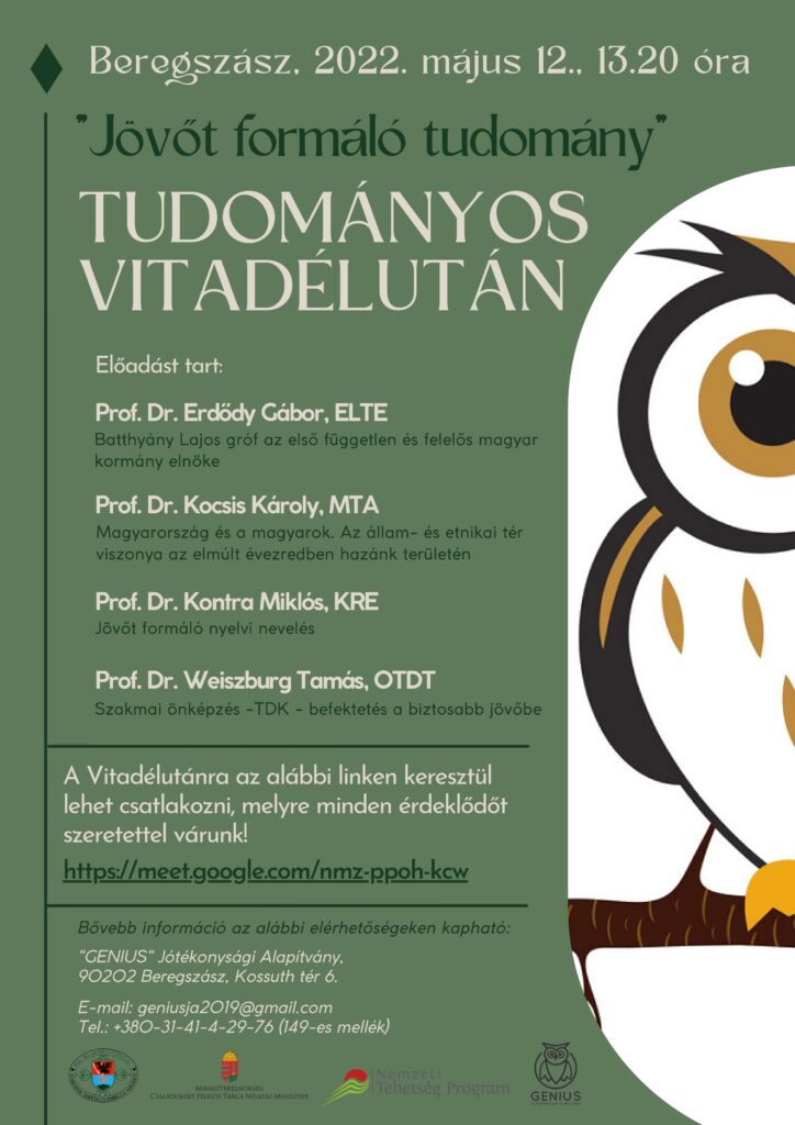 A II. Rákóczi Ferenc Kárpátaljai Magyar Főiskola és a „GENIUS” Jótékonysági Alapítvány 2022. május 12-én „Jövőt formáló tudomány” címmel tudományos vitadélutánt szervez a főiskola bázisán.