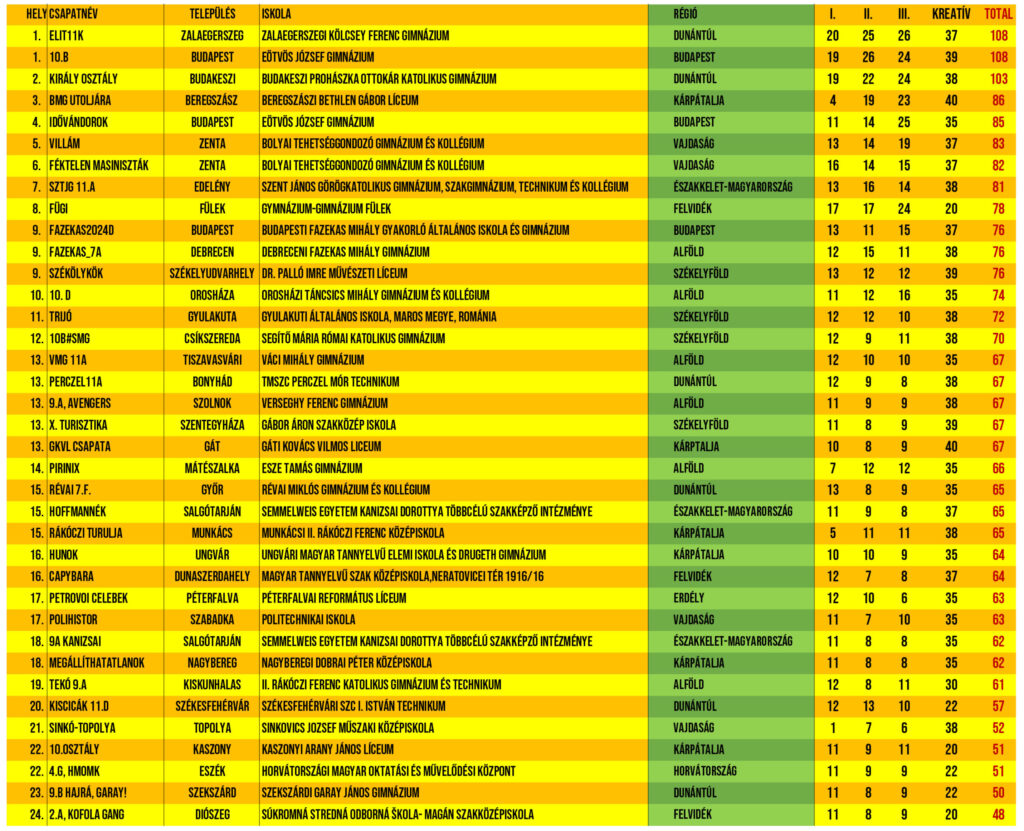 A vetélkedő első helyezettje holtversenyben a Budapesti Eötvös Gimnázium 10 b osztálya és a Zalaegerszegi Kölcsey Ferenc 11K osztálya lett. A második helyen a Budakeszi Prohászka Ottokár Katolikus Gimnázium csapata, a harmadik helyen pedig a Beregszászi Bethlen Gábor Líceum osztálya végzett.