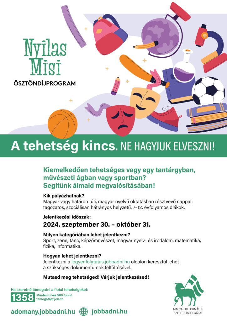 A nyár végi tanszeradományokat követően ősztől a tehetségek támogatására fókuszál a Magyar Református Szeretetszolgálat. A Nyilas Misi Ösztöndíjprogram azoknak az 7-12. évfolyamos diákoknak nyújt támogatást, akiknek nehéz anyagi helyzetük miatt szükségük van anyagi segítségre tehetségük kibontakoztatásához. A különböző foglalkozások költségei, az eszközök megvásárlása, valamint a versenyek nevezési díjai ugyanis jelentős költséget jelentenek a családok számára, legyen szó akár új sporteszközök vásárlásáról, fellépő ruhák készíttetéséről vagy a különböző versenyek nevezési díjairól.