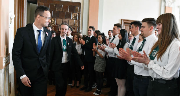 A gimnázium vezetése az iskola megmentésében és újraindításában vállalt szerepének elismeréséül tüntette ki Szijjártó Pétert.