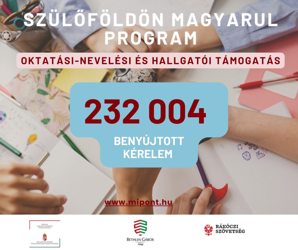 Április 8. és május 8. között nyújthatták be kérelmeiket a külhoni magyar tannyelvű oktatási intézményeket látogató diákok szülei, illetve a tanulmányaikat magyar nyelven végző felsőoktatási hallgatók a Szülőföldön Magyarul Programra. Összesen 232 004 kérelmet nyújtottak be az érintettek a Kárpát-medencéből a www.mipont.hu felületen.
