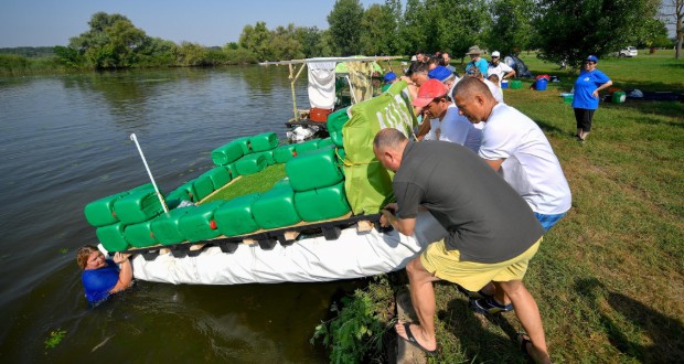 Csendesen csobbant a Tisza-tóba a PET palackokból és más újrahasznosított anyagokból kézzel készített tutaj. A PET Vidra csapat hajójának fedélzetén a szemétnek jutott a legtöbb hely.