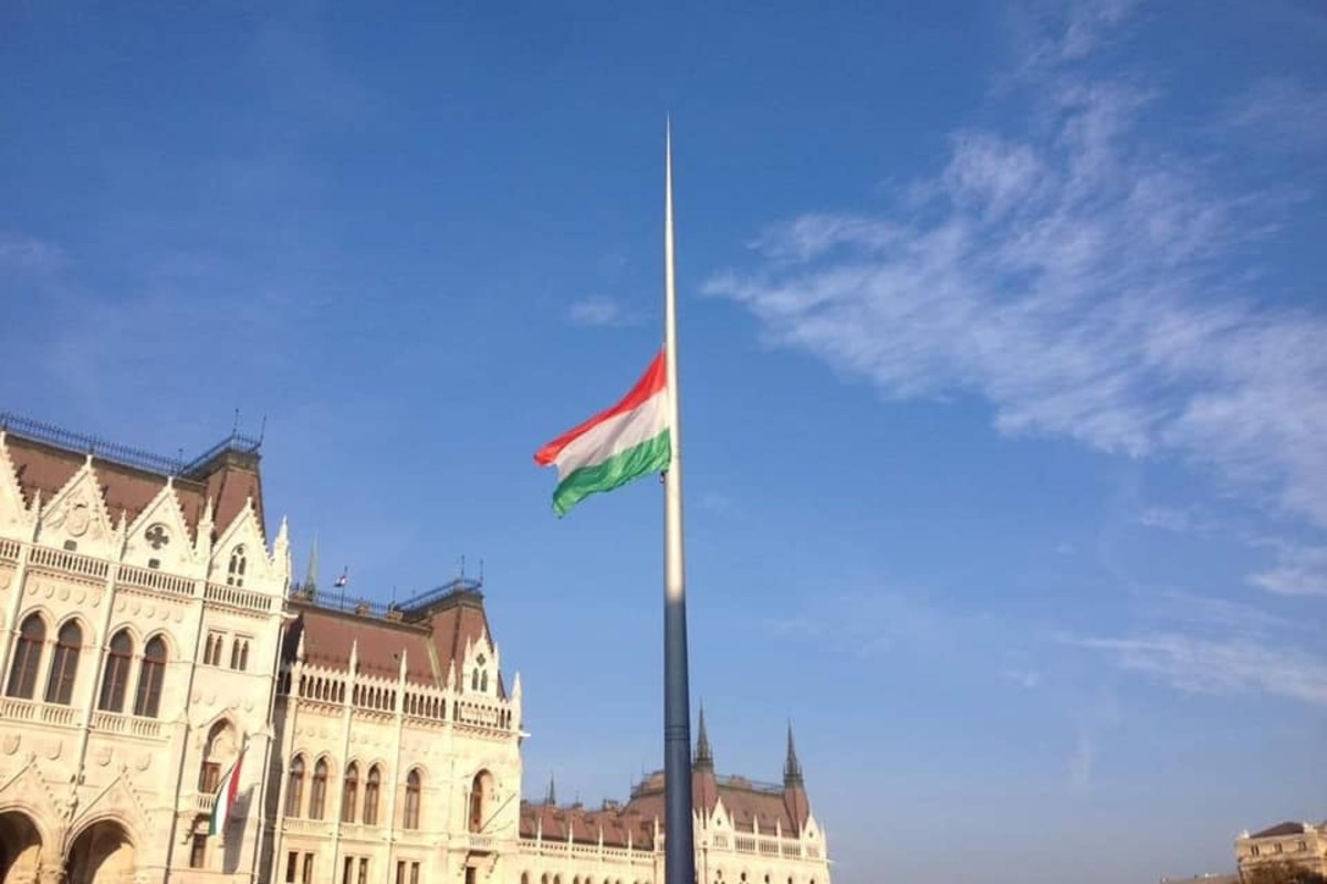 A Parlamentre kitűztek egy lyukas magyar zászlót és egy fekete gyászzászlót.