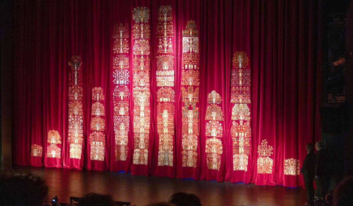 Felavatták a Nemzeti Színház új nagyszínpadi díszfüggönyét vasárnap. A százhatvanhét négyzetméteres alkotás száznégy kézi hímző munkájának eredménye.