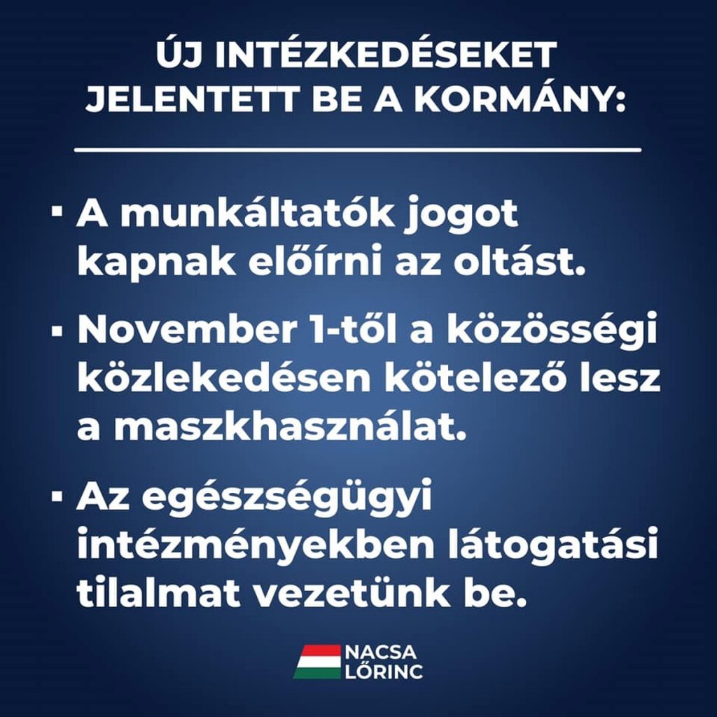 November 1-től maszkot kell viselni a közösségi közlekedési eszközökön – sorolta a kormány döntéseit, amelyeket a járvány fékezése érdekében hozott. Emellett látogatási tilalmat rendelnek el az egészségügyi intézményekben. A szociális intézményekben erről a vezető dönthet.