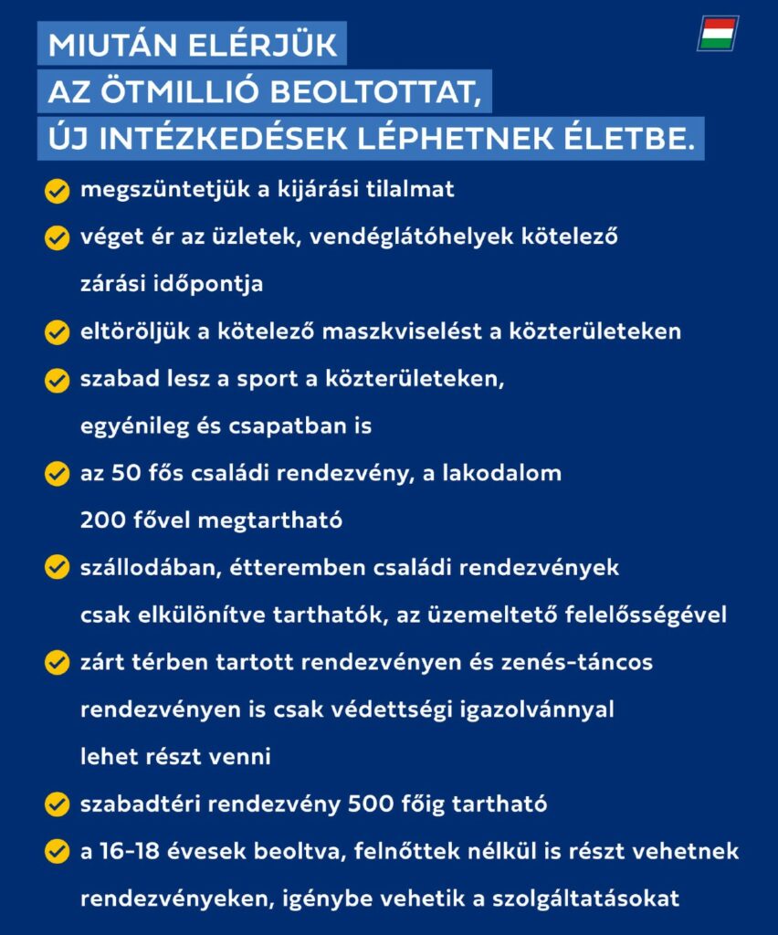 Orbán Viktor közölte: amint az oltottak száma eléri az ötmilliót, megszűnik a kijárási tilalom, a vendéglátóhelyek és üzletek kötelező zárási időpontja, a közterületi maszkviselés, az egyéni és csapatsport korlátozás nélkül végezhető a szabadban.