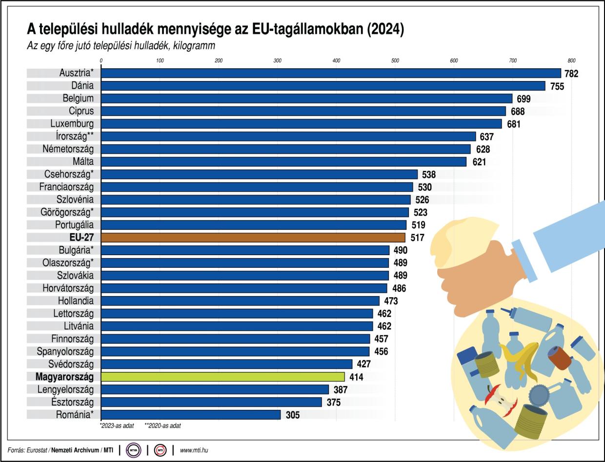 Az Európai Unióban az egy főre jutó települési hulladék mennyisége 517 kilogramm volt 2024-ben, 6 kilogrammal több, mint 2023-ban; Magyarországon a vizsgált évben 414 kilogramm hulladékot termeltek személyenként – közölte az Európai Unió statisztikai hivatala, az Eurostat hétfőn.