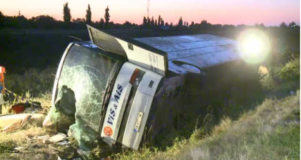 A Mediafax hírügynökség jelentése szerint az autóbusz Bulgáriából Ukrajna felé tartott, amikor a romániai Konstancát Bukaresttel összekötő autópályán letért az útról és oldalára dőlt. A hatóságok feltételezik, hogy elaludt a sofőr.