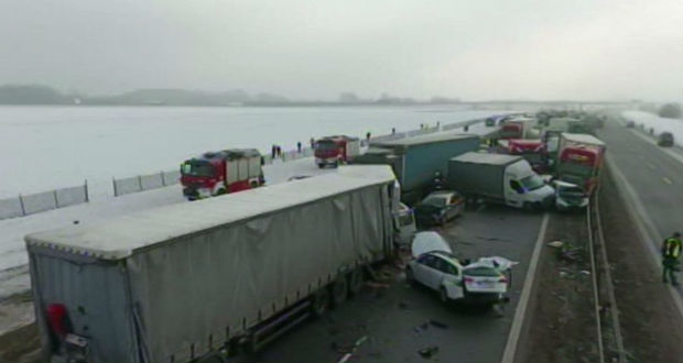 Végeláthatatlan kocsisort filmezett le a reggeli órákban a lengyelországi A1-es autópályán Lodzs városnál egy, a sztrádán haladó autós. Egymásba ütközött kamionok, személyautók, kisteherautók torlódtak fel a sűrű ködben és a csúszós, jeges úton.