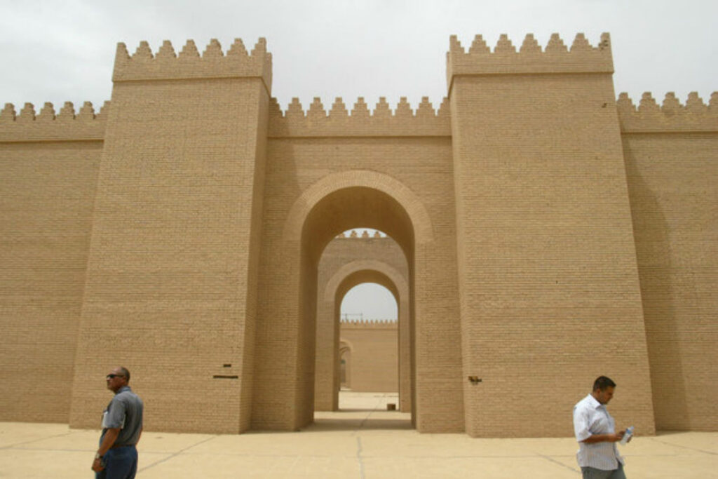 „A falak tetején egymással szemben emeletes épületeket húztak fel, közöttük pedig egy négyesfogatnak is elegendő utat hagytak. A falakon körben száz torony áll, amelyek, akárcsak az ajtók és küszöbök, bronzból készültek” – írta Hérodotosz a Babilon több százezer lakosának biztonságát óvó hatalmas falrendszerről.