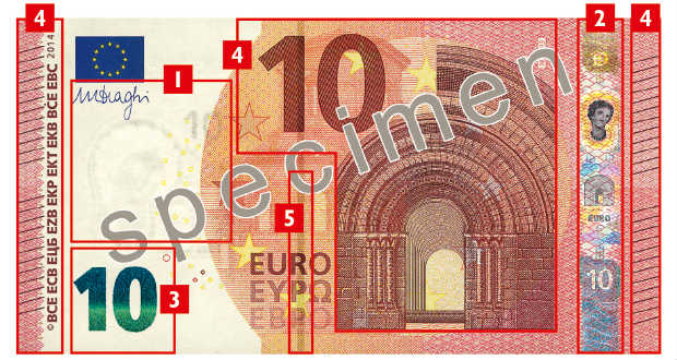 Az új 10 eurós biztonságát szolgálja az új hologramcsík és az új vízjel is, amelyeken Európa látható a görög mitológiából. Emellett a rajta található számjegy a bankjegyet megdöntve smaragdzöld és sötétkék árnyalatban csillog, ami gyakorlatilag egyetlen mozdulattal ellenőrizhető. Az uniós jegybank emellett már 9 hónappal a hivatalos bevezetést megelőzően rendelkezésére bocsátotta a bankjegyet azoknak a vállalatoknak, amelyek a pénzek eredetiségét ellenőrző berendezéseket gyártanak.