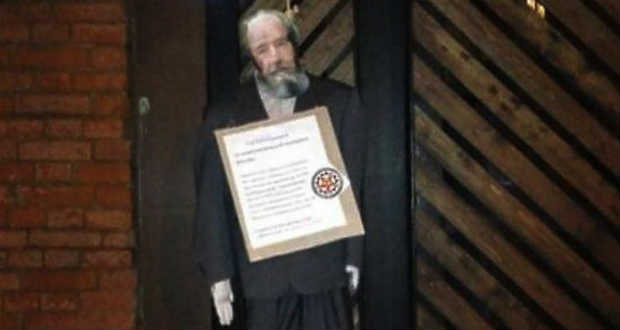 Alekszandr Szolzsenyicint ábrázoló bábut akasztottak a moszkvai Gulag Múzeum kapujára, a figura mellére tűzött tábla árulónak, lelkiismeretlen hazudozónak és a haza első számú ellenségének nevezte a Nobel-díjas orosz írót.