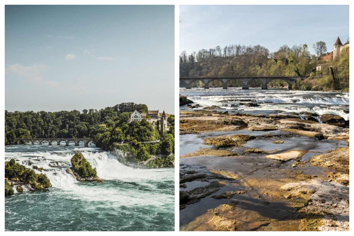 A 150 méter szélességben, 23 méteres magasságból lezúduló Rajna-vízesés vízhozama csupán a fele az áprilisban szokásosnak.