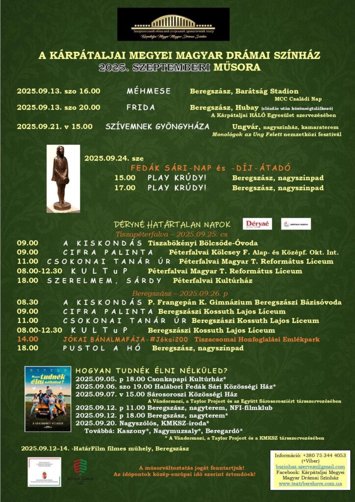 Közzétette szeptemberi műsorrendjét a Kárpátalja Megyei Magyar Drámai Színház Facebook-oldalán. Művészeikkel Beregszászban, Ungváron, Tiszabökényben és Péterfalván is találkozhatnak a nézők.