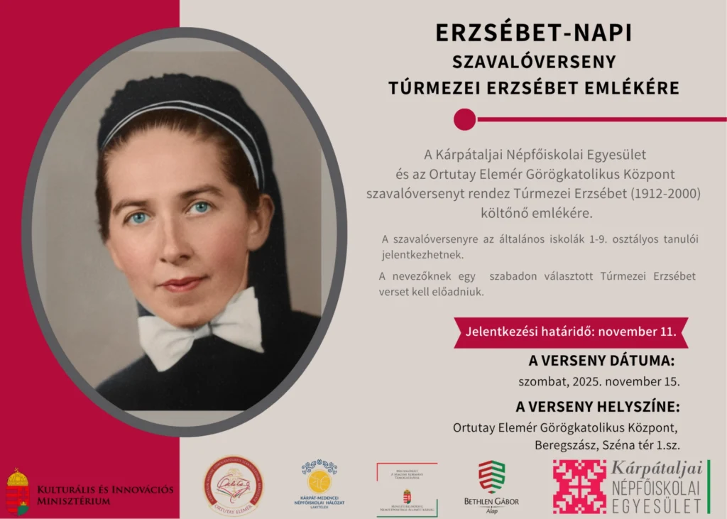 A Kárpátaljai Népfőiskolai Egyesület és az Ortutay Elemér Görögkatolikus Központ szavalóversenyt hirdet Túrmezei Erzsébet (1912–2000) költő és műfordító emlékére.