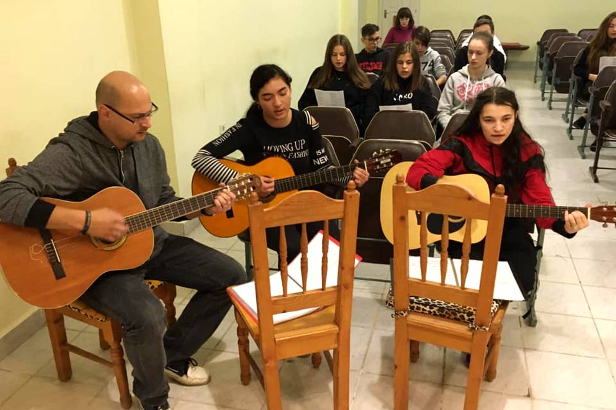­– Csak az akkordok megtanításával foglalkozom. Az a foglalkozás célja, hogy ha majd énekel a szentmisén, akkor tudja magát kísérni gitárral. Olyan 20-30 akkordot tanulnak meg velem, és különböző ritmusokat sajátítanak el. Ezekkel bármit le tudnak játszani. Ami még szebbé teszi a lassú dalokat, az a bontás – ezt is átvesszük velük.