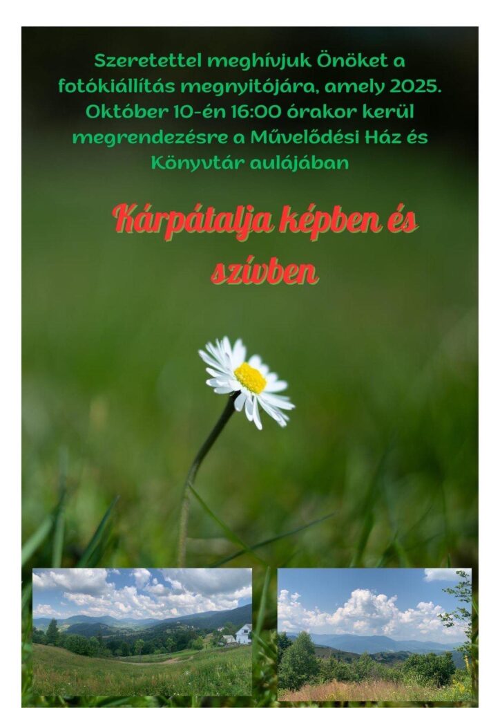 Kárpátalja képben és szívben elnevezésű fotókiállítás nyílik 2025. október 10-én Záhonyban. A közép-európai idő szerint 16.00 órakor nyíló tárlat a városi Művelődési Ház és Könyvtár aulájában tekinthető meg – olvasható Ukrajna Magyarországi Nagykövetsége Facebook-oldalán.